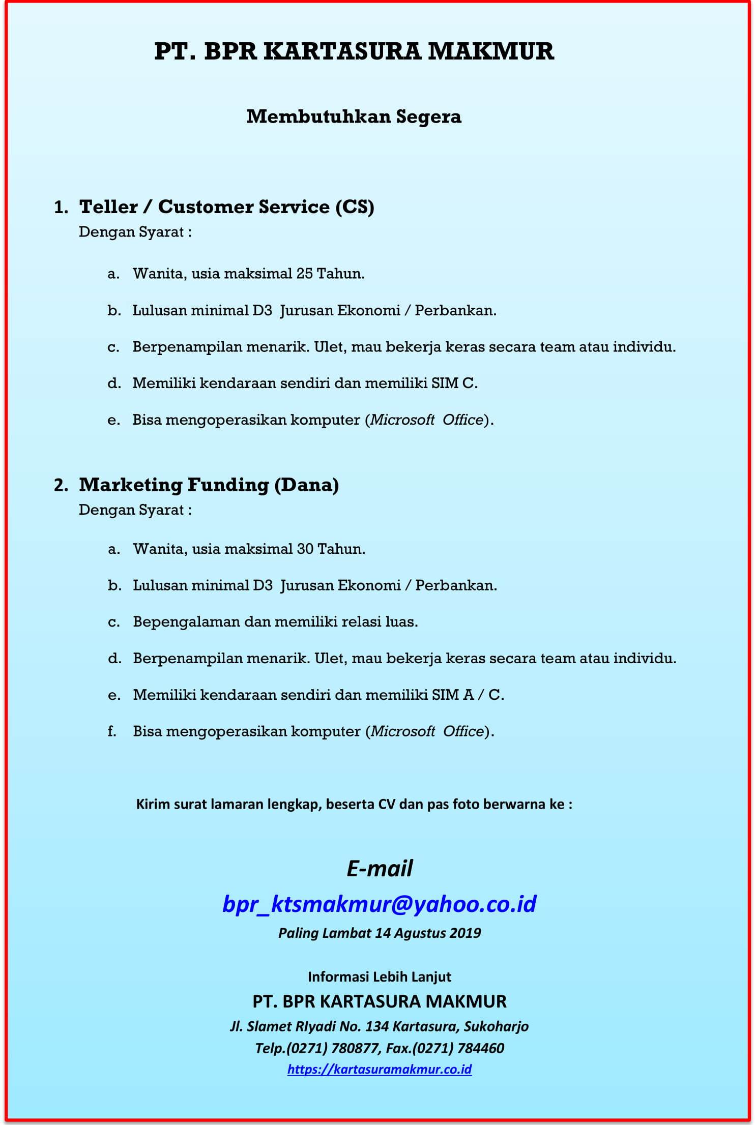 LOWONGAN KERJA PT. BPR KARTASURA MAKMUR AGUSTUS 2019